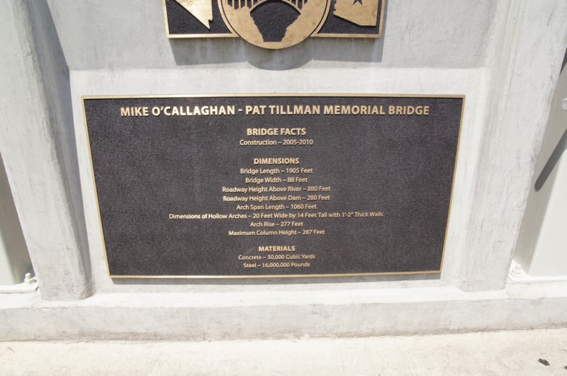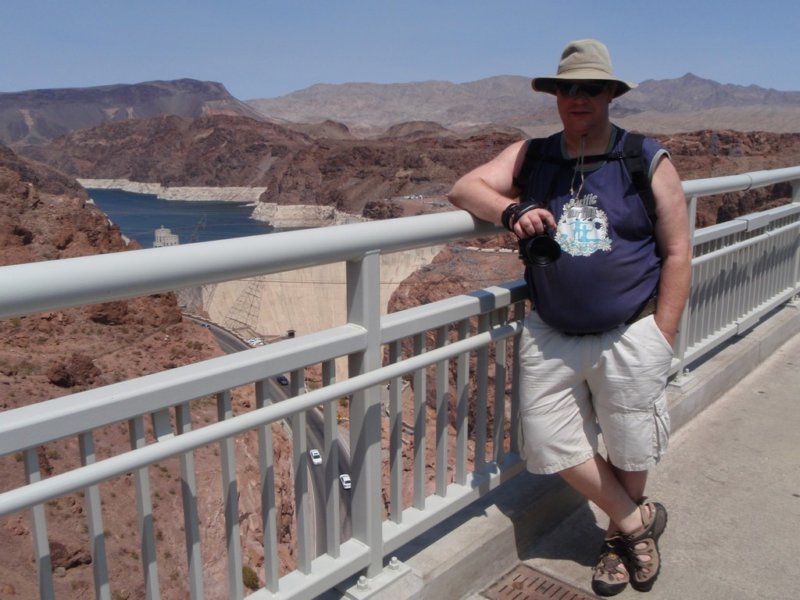 Je zit door de leuning van de brug de oude weg en de Hoover Dam.